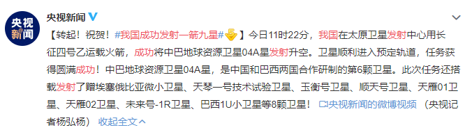 2019年12月20日11时22分,一件轰动全国的大事发生了!太原卫星发射中心用长征四号乙运载火箭发射成功中巴地球资源卫星04A星,一同发射的还有中关村壹号商业航天企业微纳星空的仪征一号(天雁01)、星时代-8(天雁02)和未来号-1R3颗卫星。这是商业航天划时代的“升空”!
