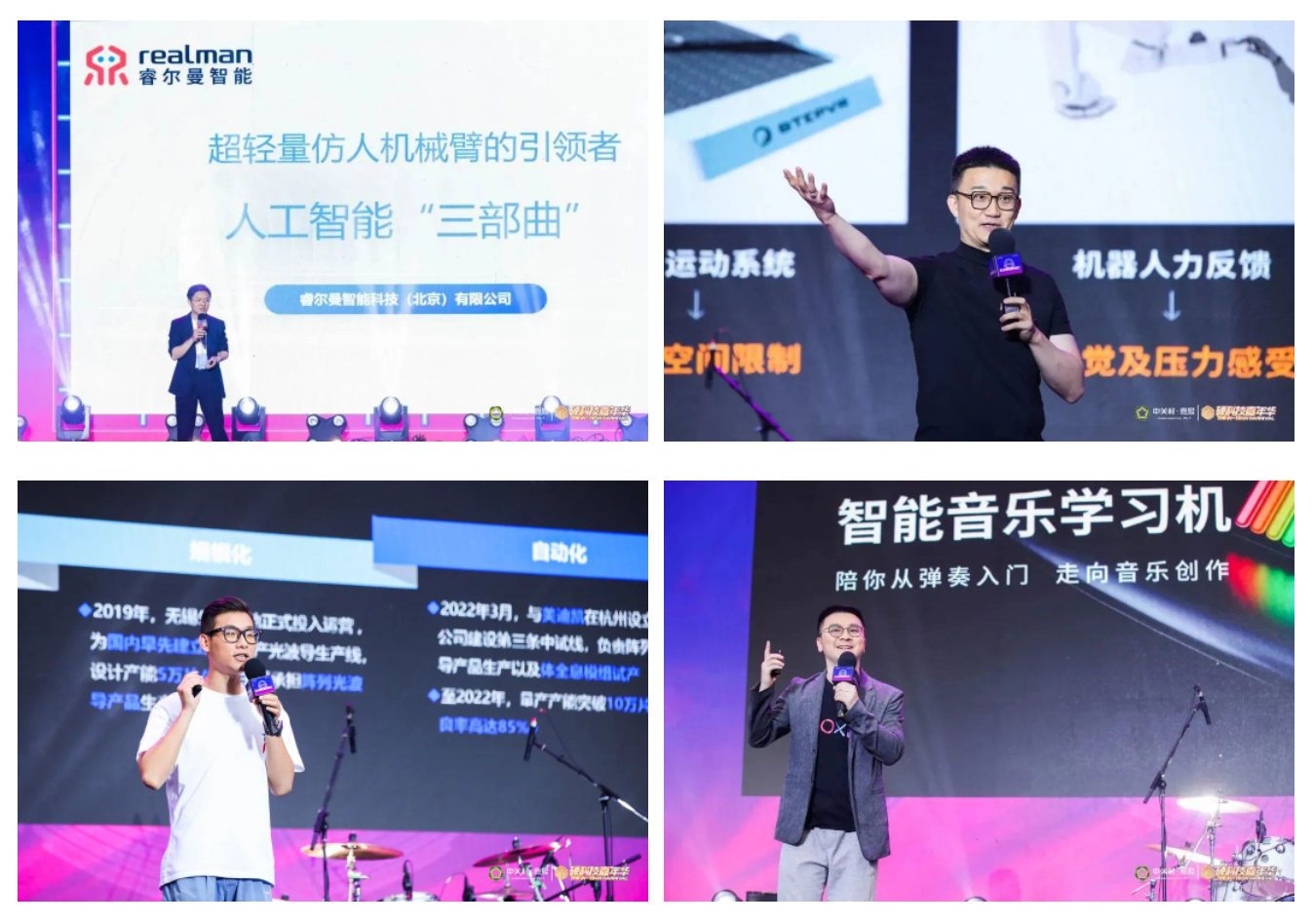 本届嘉年华的最大亮点莫过于硬科技新技术新产品全球首发首秀。灵犀微光轻薄型AR眼镜阿拉丁Zero、丁责智娱竞技AI机器人“不朽机甲”、睿尔曼超轻量仿人机械臂、视感科技音乐密码-音乐盒子、康小虎元气垫和护眼仪、声智科技云耳开放式无线耳机、诺非技术好运锦鲤仿生鱼、STEPVR元宇宙任意门、起源跃动极简VR全身追踪系统等新技术新产品在首发奇妙夜舞台上进行了首发介绍。