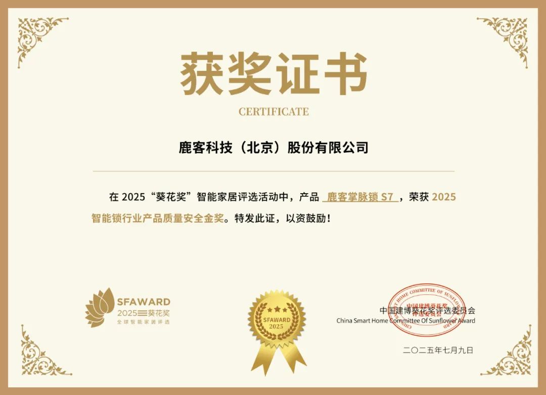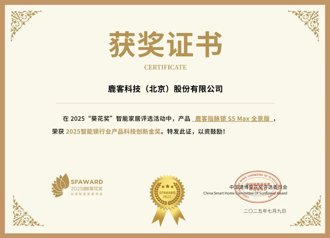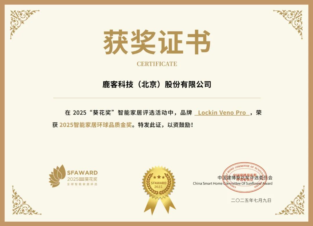 近日,在第九届中国建博会葵花奖颁奖盛典上,壹号企业鹿客科技荣获四项顶级大奖:智能锁行业领导力品牌奖、产品质量安全金奖(掌脉锁 S7)、产品科技创新金奖(指脉锁 S5 Max 全景版)、以及环球品质金奖(Lockin Veno Pro)。这些奖项彰显了鹿客在智能安防领域的技术创新与全球影响力。