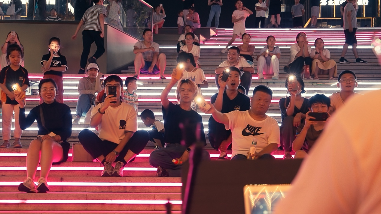 露天电影的银幕亮起 夏日开放麦的歌声响起 台阶便是看台 有人倚着栏杆 有人靠着朋友 光影在他们专注的脸上流动 偶尔的轻声交流、低低笑语 被夏夜微凉的风托起 将白日的忙碌,一丝丝吹散