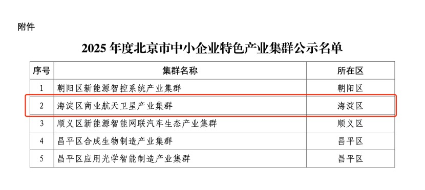7月14日,北京市经济和信息化局发布通知,公布“2025年度北京市中小企业特色产业集群名单”入选名单。中关村壹号凭借其在商业航天卫星产业领域的特色产业集聚成效、科技创新与产业培育的运营服务能力,成功获认定为“海淀区商业航天卫星产业集群”。